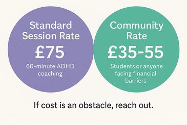 ADHD support shouldn’t be a luxury. It should be available to anyone who needs it. My mission is to make coaching open, human, and affordable, because understanding your mind shouldn’t depend on your income or circumstance. I offer flexible pricing so everyone can access meaningful support.